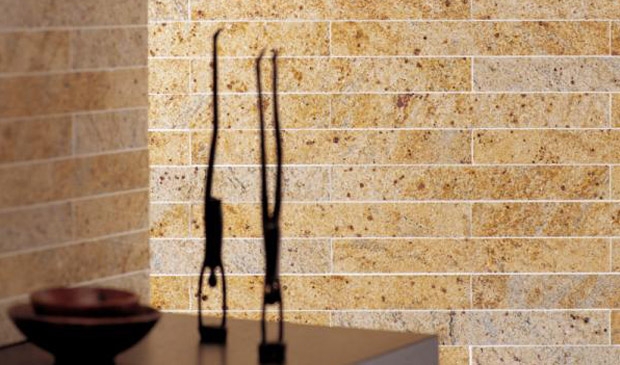 Стены комнаты облицованы прямоугольной плиткой гранита Kashmir Gold. Обратите внимание на нетрадиционную форму плитки — узкие полосы. Также весьма редко можно встретить отделку стен шлифованным камнем.