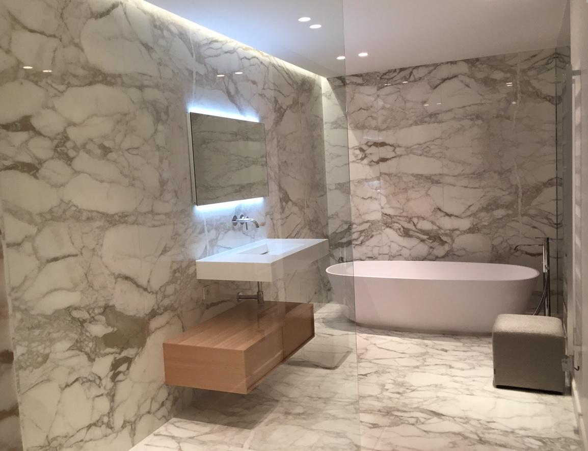 Ключевые особенности дизайна: простая геометрия линий, минимализм в декоре, обилие пустого пространства. Для пола и стен был использован мрамор Calacatta Gold в формате крупных продолговатых плит с полированной фактурой. Дизайнер выбрал плиты с ярко-выраженной прожилковатостью.