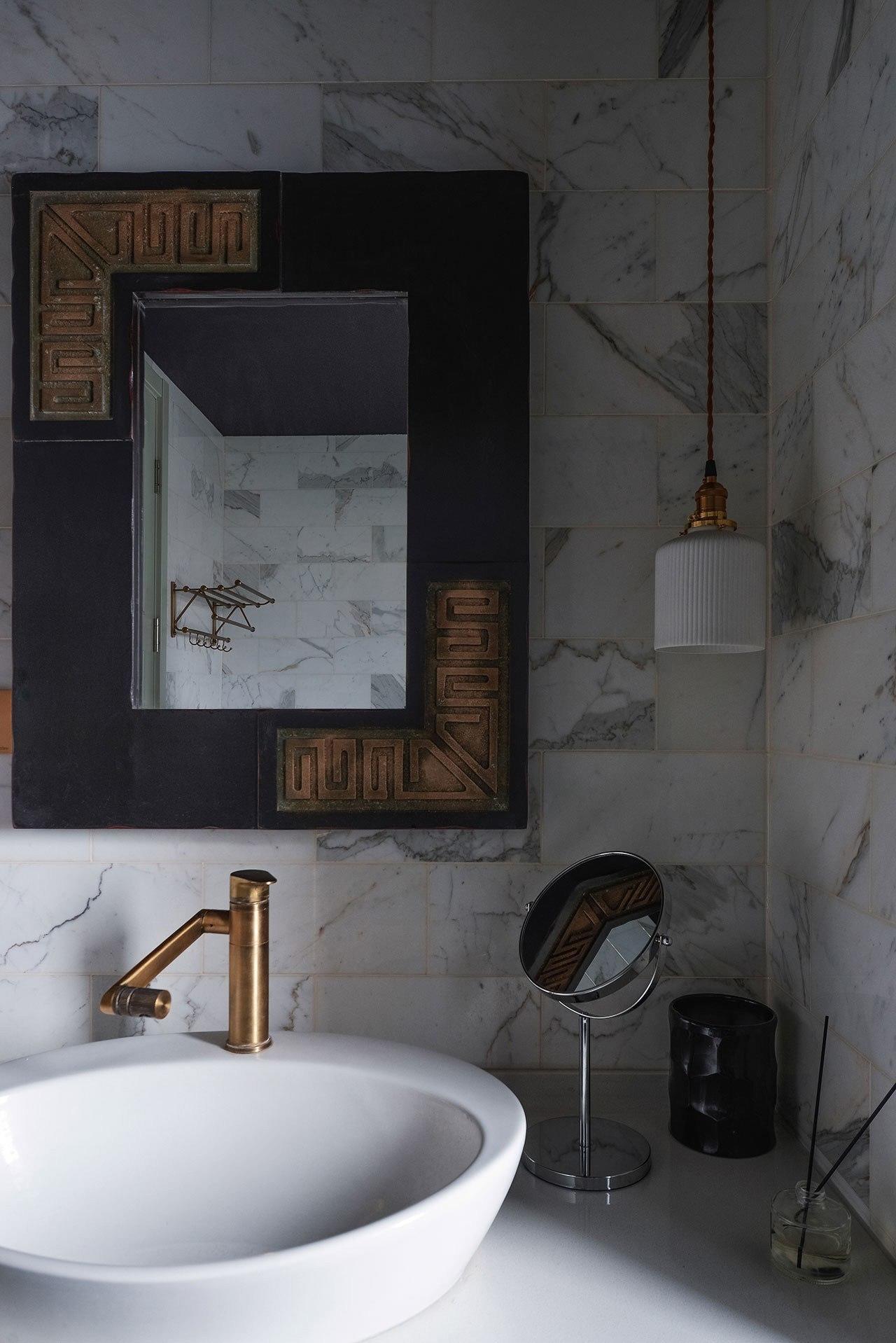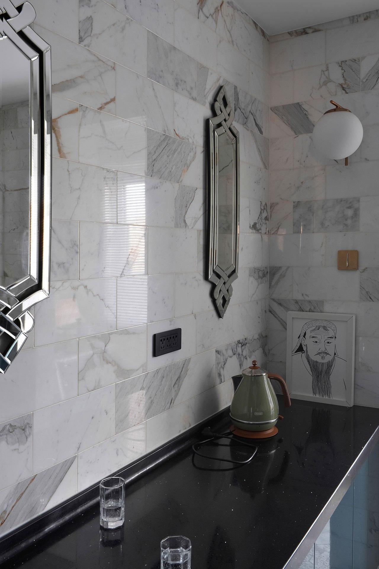 Нам особенно интересен дизайн кухни - ее стены покрыты плиткой белого мрамора лучших итальянских сортов: Bianco Carrara, Bianco Gioia, Calacatta Vagli, Calacatta Gold и Bianco Statuario. Установленная в хаотичном порядке плитка создает живописный фон из разнонаправленных серых и золотистых прожилок.