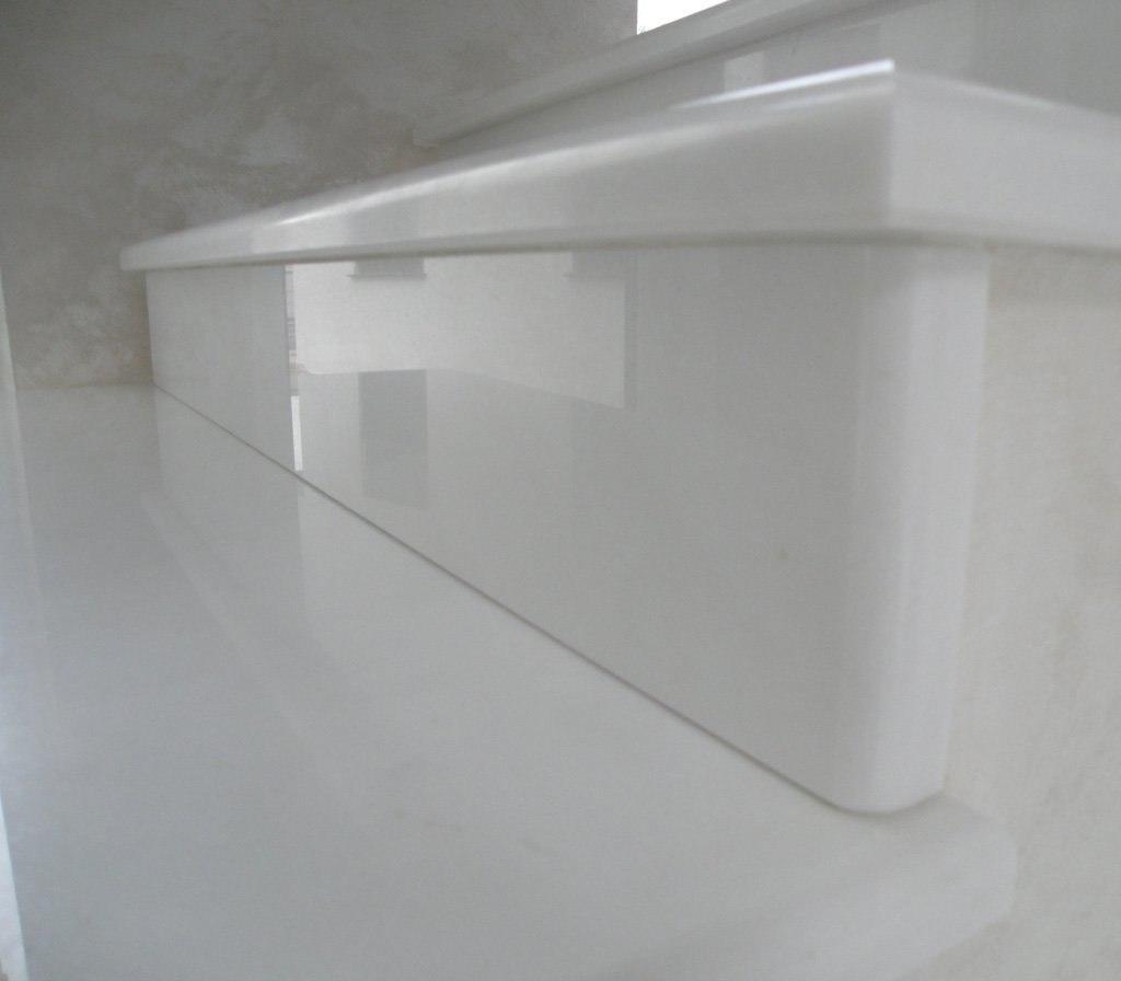 Все элементы лестницы облицованы полированным мрамором White Crystal - ступени, подступенки и боковые элементы. За счет радиальной формы и сглаженного профиля ступеней, вид конструкции заметно смягчен, сглажен.
