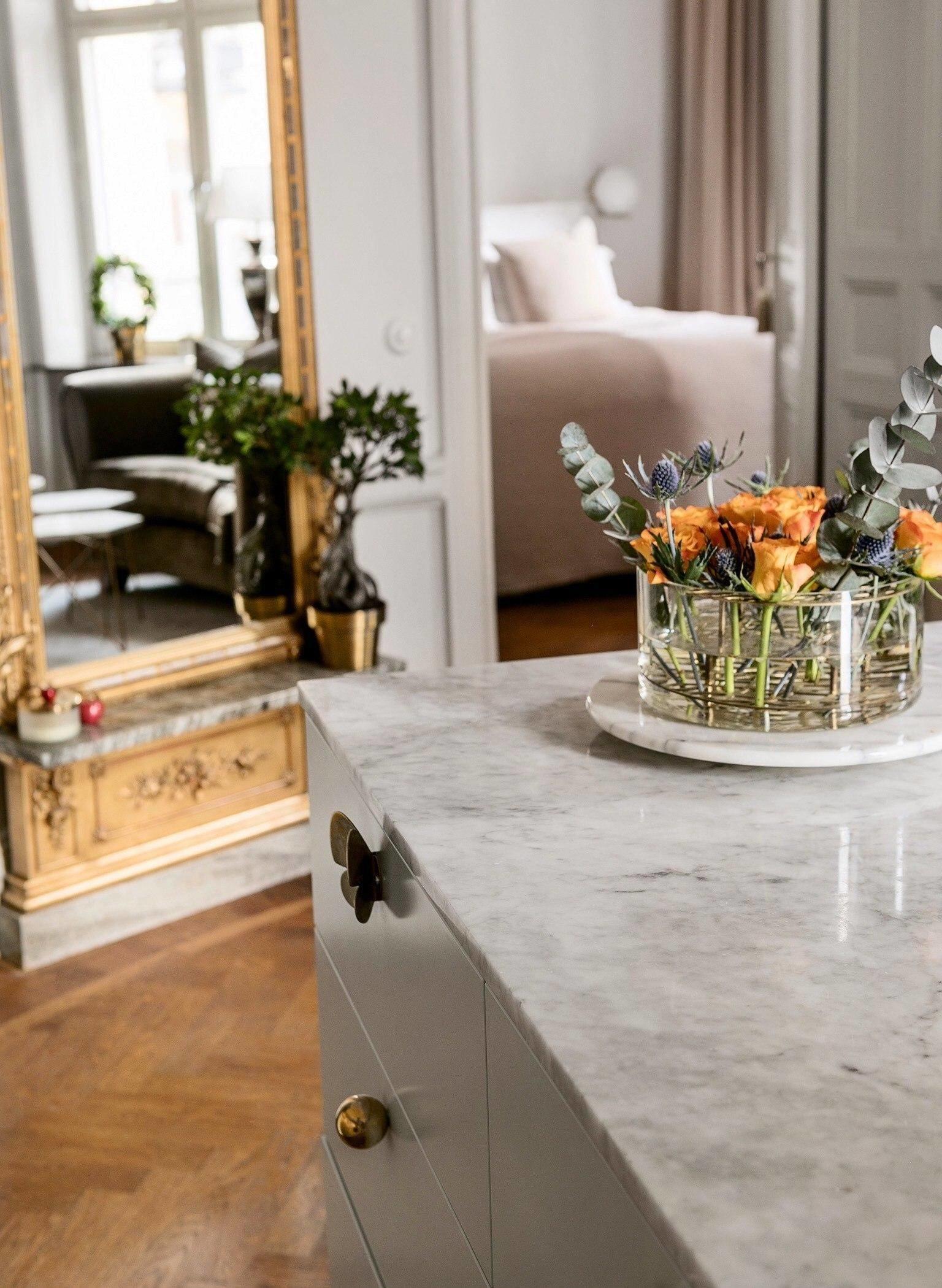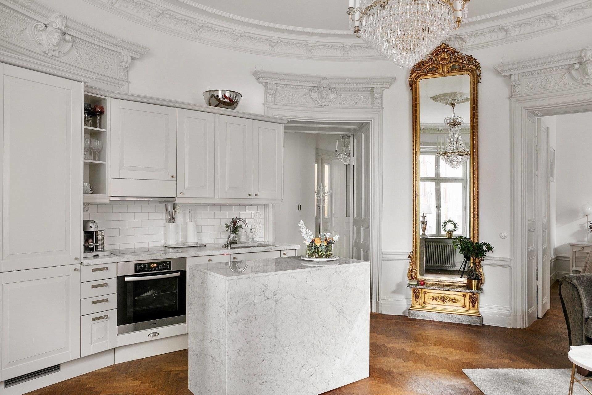 Кухонный остров с четырех сторон покрыт полированными плитами легендарного каррарского мрамора. Им же облицованы столешницы рабочей зоны по периметру.
