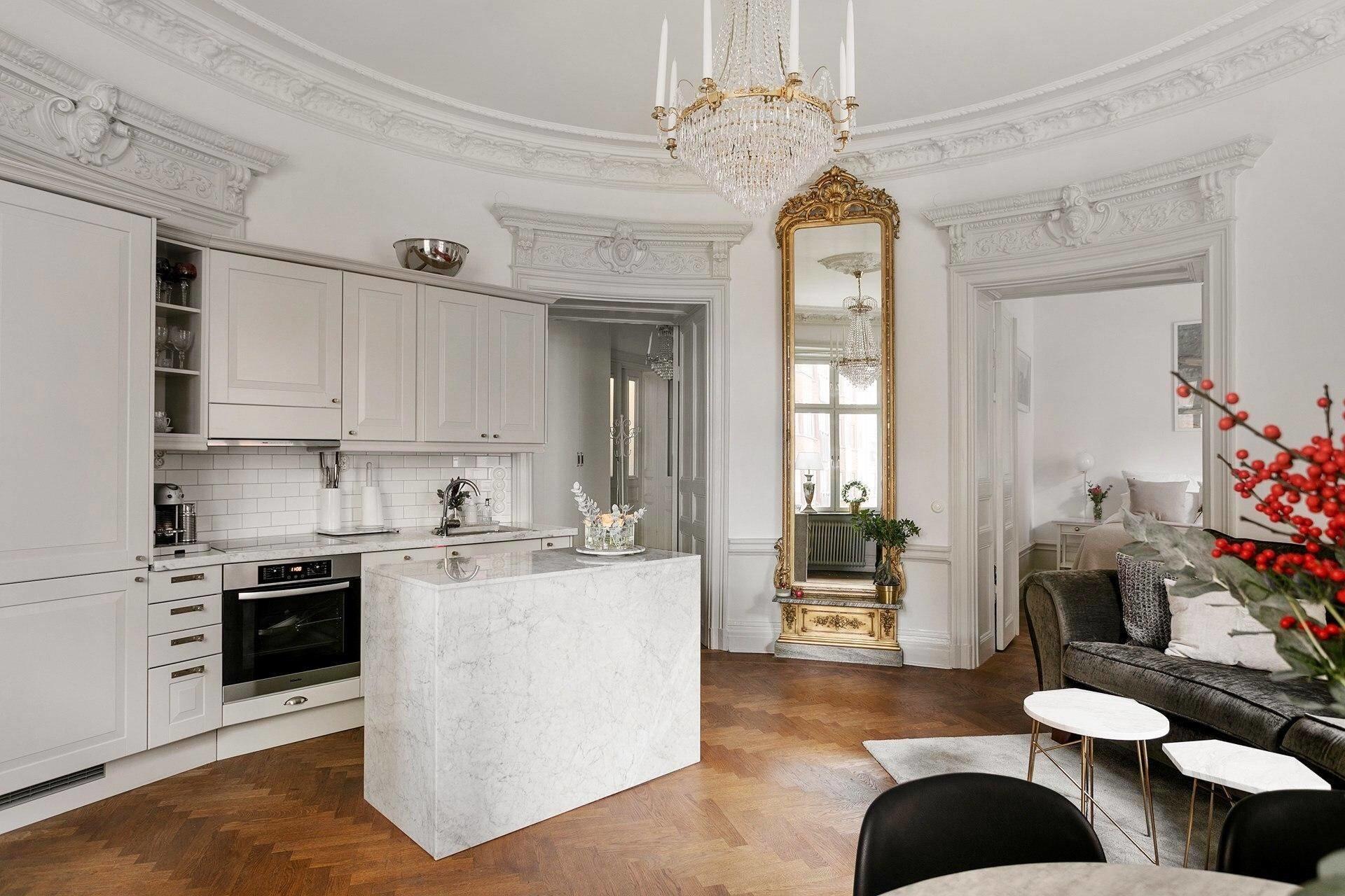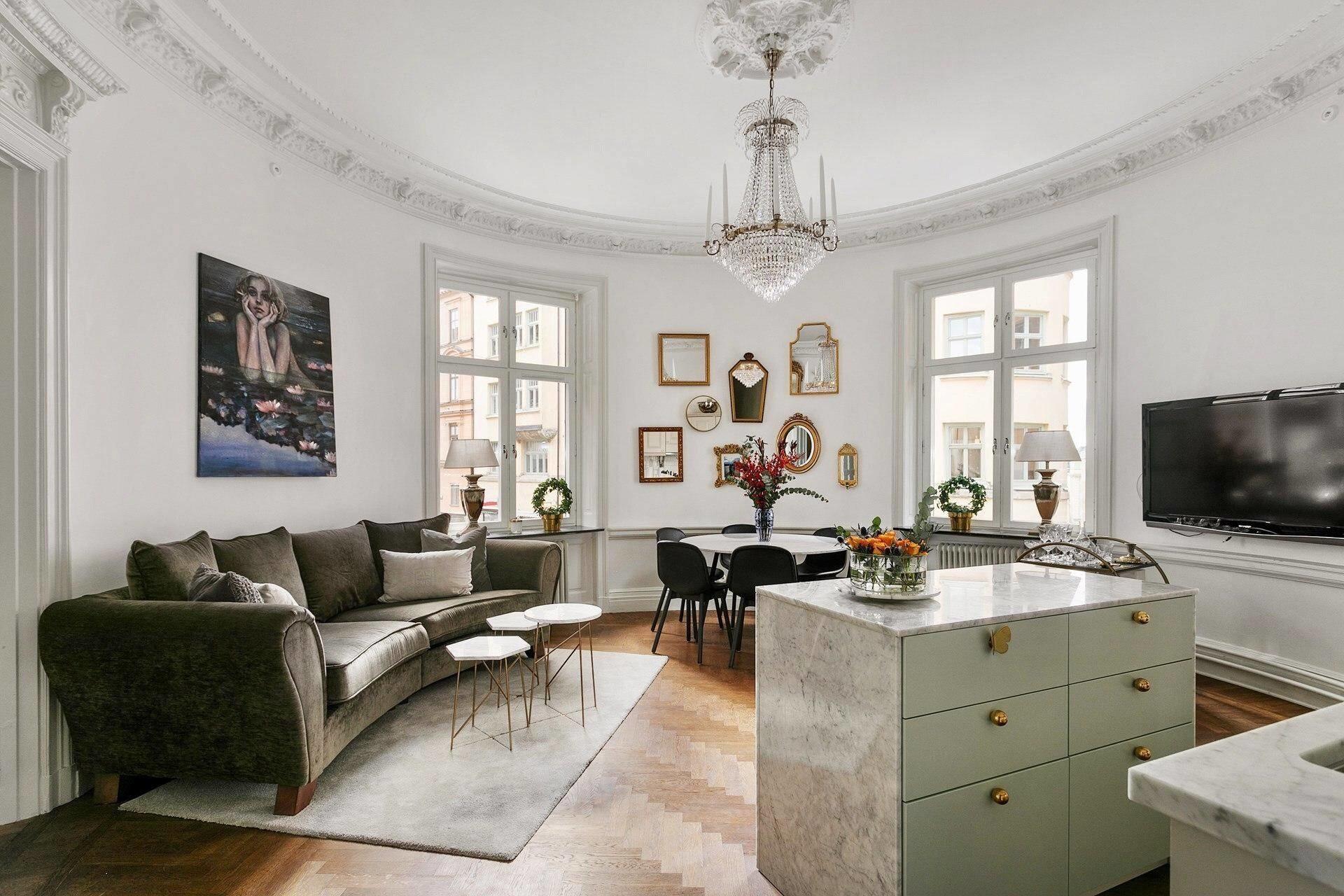 Потрясающий проект реконструкции круглой комнаты в старинном доме. Круглая зала превращена в элегантную и уютную студию, совмещающую кухню, столовую и гостиную.