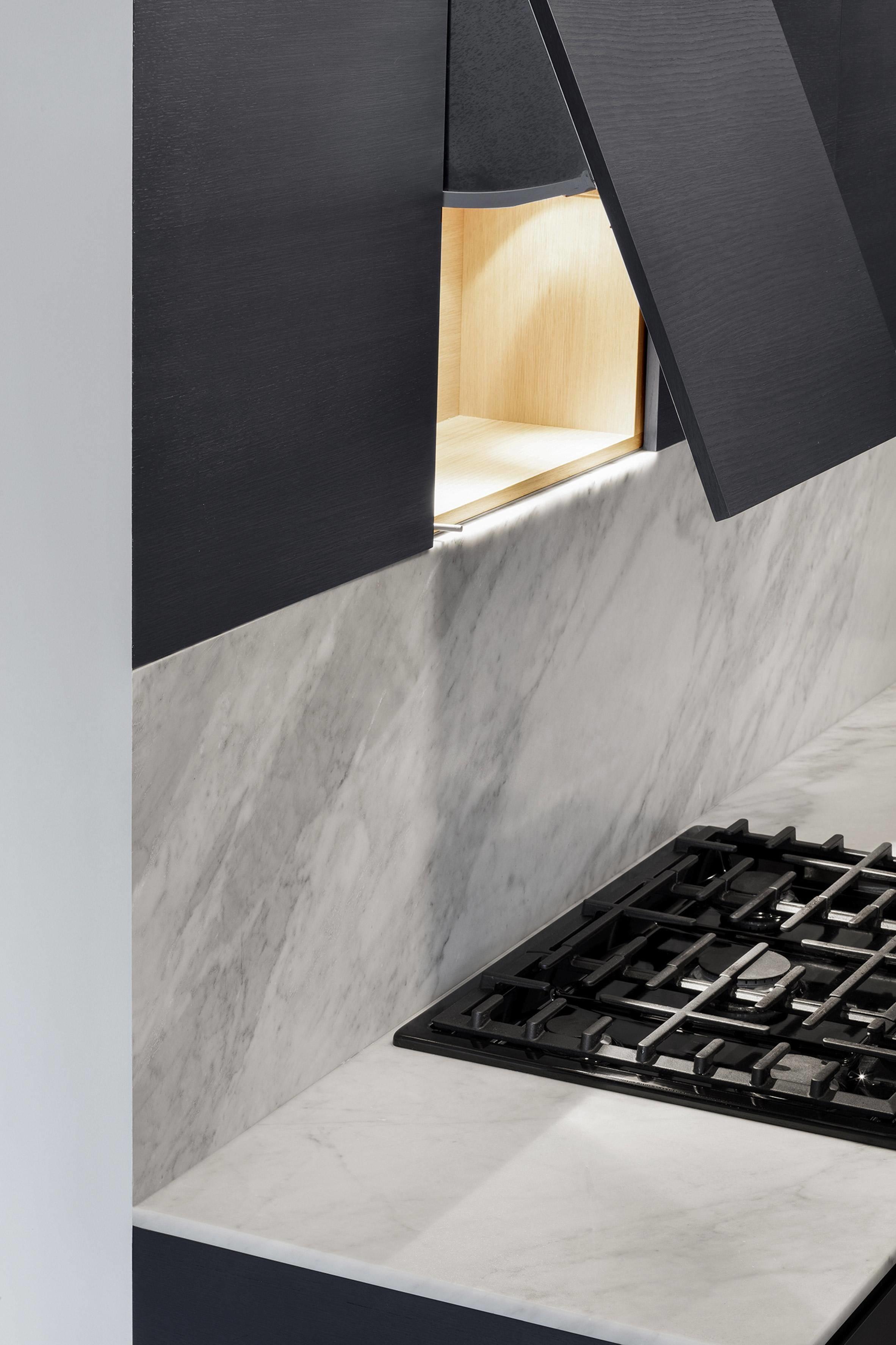 Столешница рабочей зоны и фартук выполнены из классического каррарского мрамора - белоснежного, с сетью светло-серых прожилок.