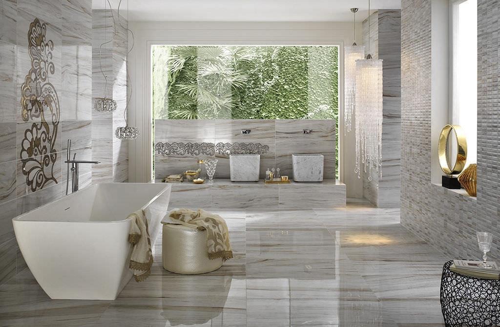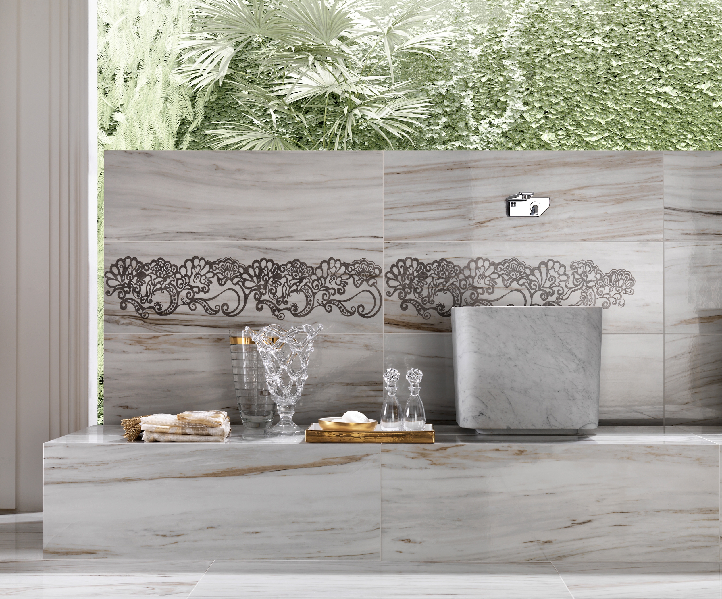 Для отделки стен, пола, низкой столешницы для раковин использован полированный мрамор Calacatta Zebrino. Была тщательно отобрана плитка крупных размеров с четкой горизонтальной полосчатостью (распиловка Vein Cut). К слову сказать, такая отделка помогает визуально расширить помещение.