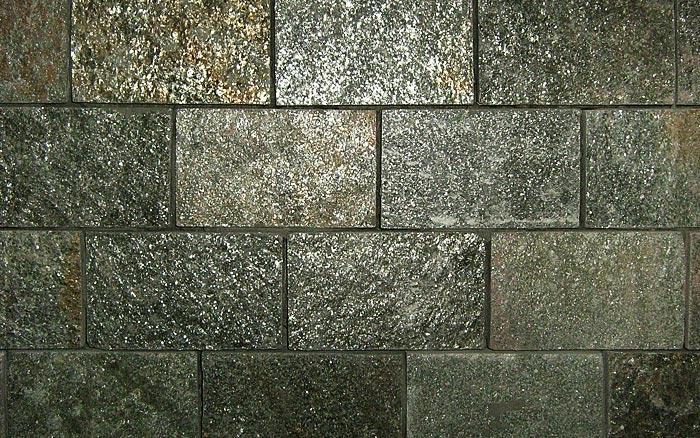 Искристый Златолит серо-зеленый был использован для масштабной облицовки стены. Мерцающая в зеленых тонах плитка сложена в так называемую кирпичную кладку.